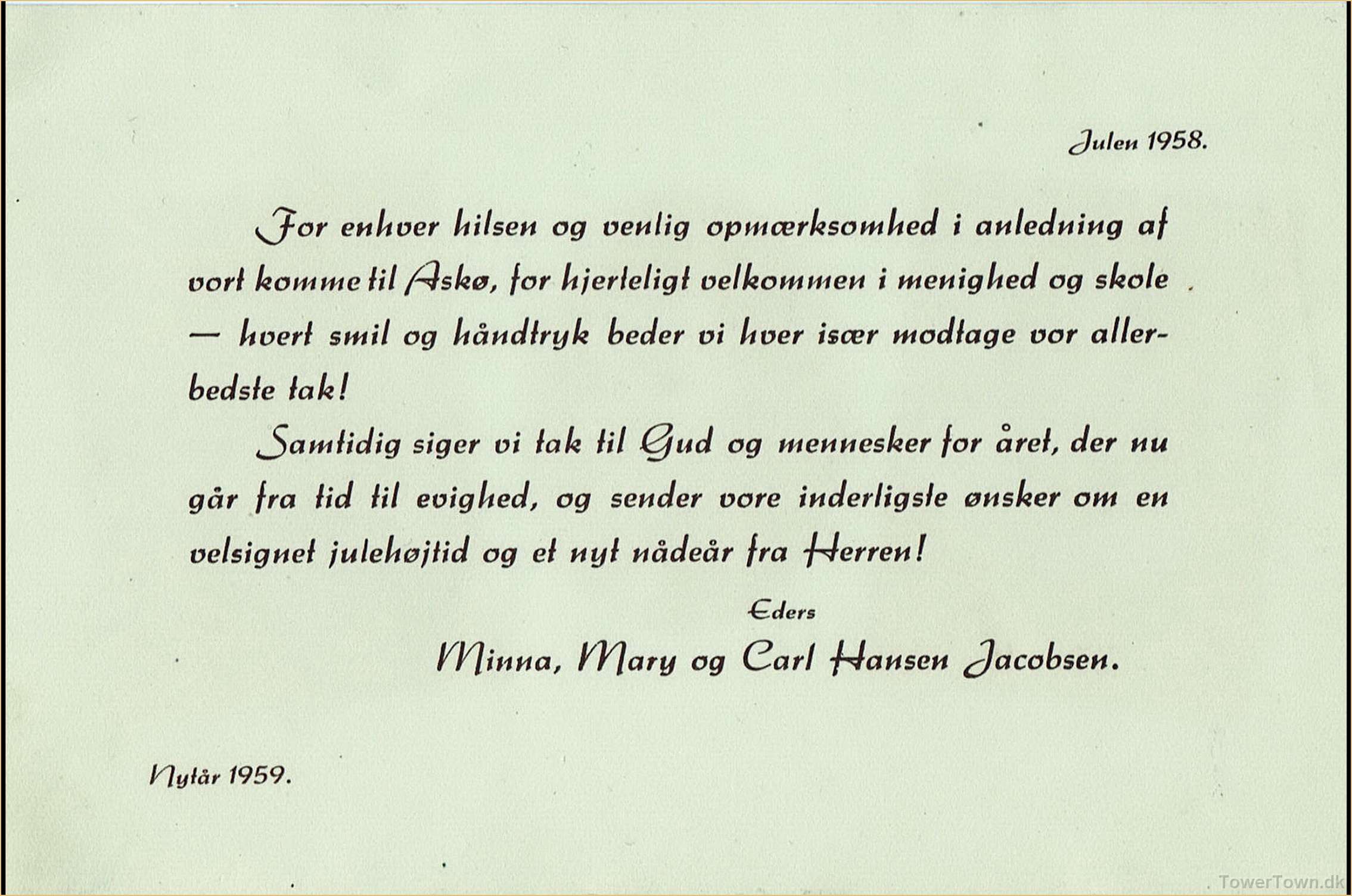 Carl Johannes William Hansen Jacobsen, præst i Islev, på Askø og i Nysted, født i Horsens den 29.04 1913 - døde i 1995, Marie Minna Andrea Sønderup født den 11.09. 1945, Mary Skov Jacobsen født i Svenstrup, Jylland den 18.04 1909 - døde 2003.