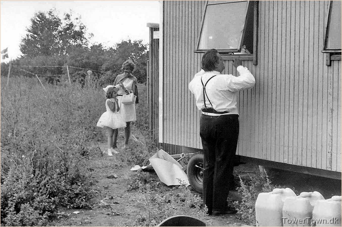 Lokation: Hovedgaden 15. Aksel Strøby, Arthur Jensen og Poul Bundgård agerer. Toilet-tilbygningen til højre er tilføjet i anledning af filmen.