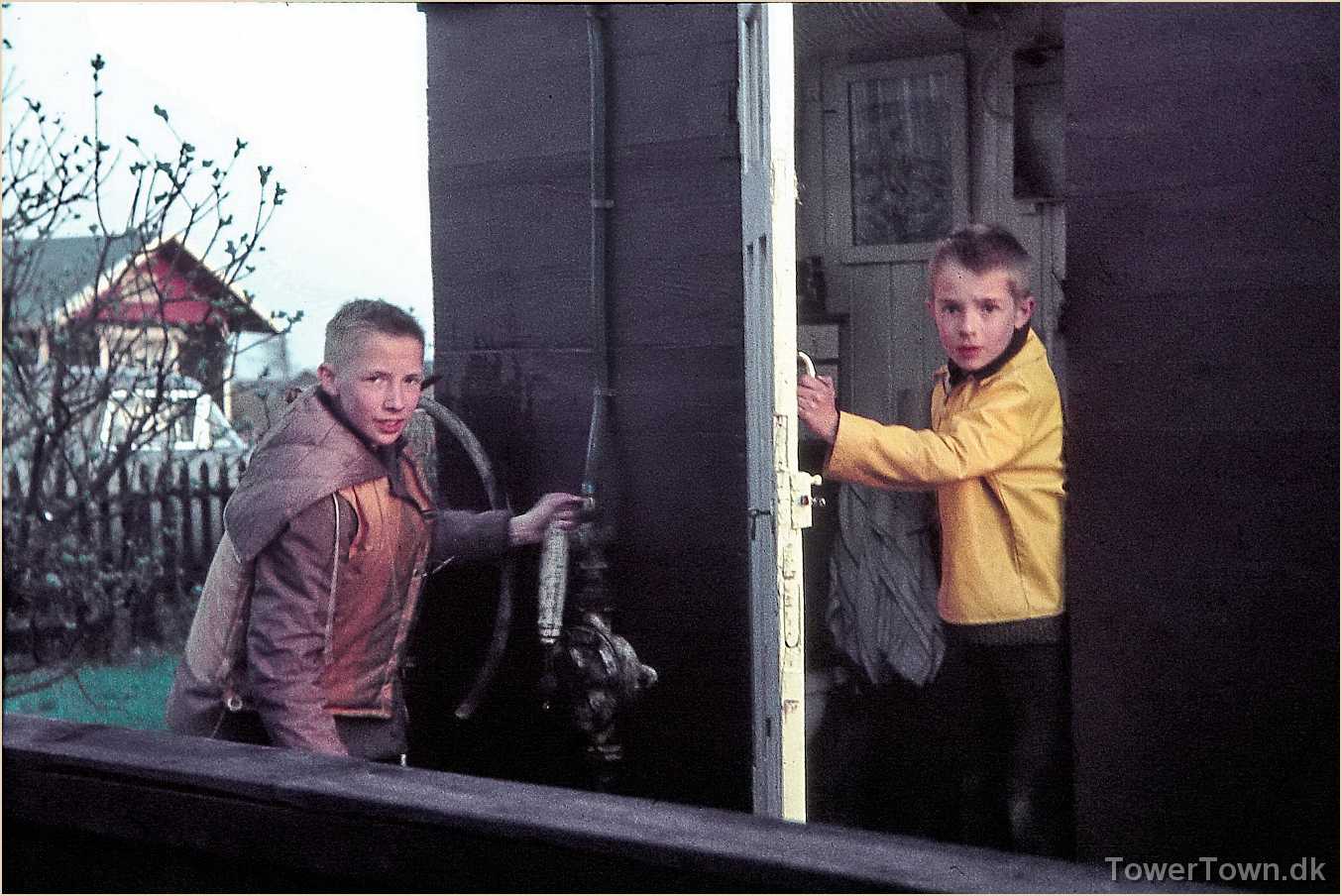 Per og Lasse. Rindende vand til toilettets håndvask blev klaret ved at pumpe hentet drikkevand op i en tank under taget hvorfra det løb til vasken via fodbetjent hane.