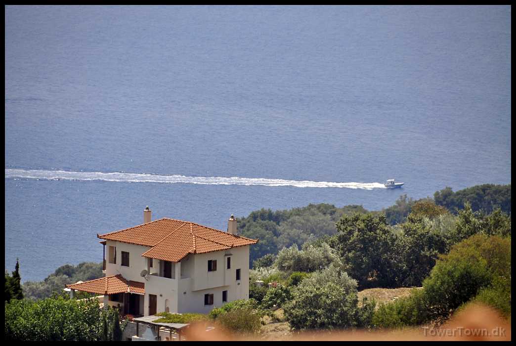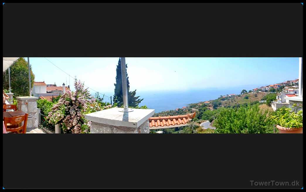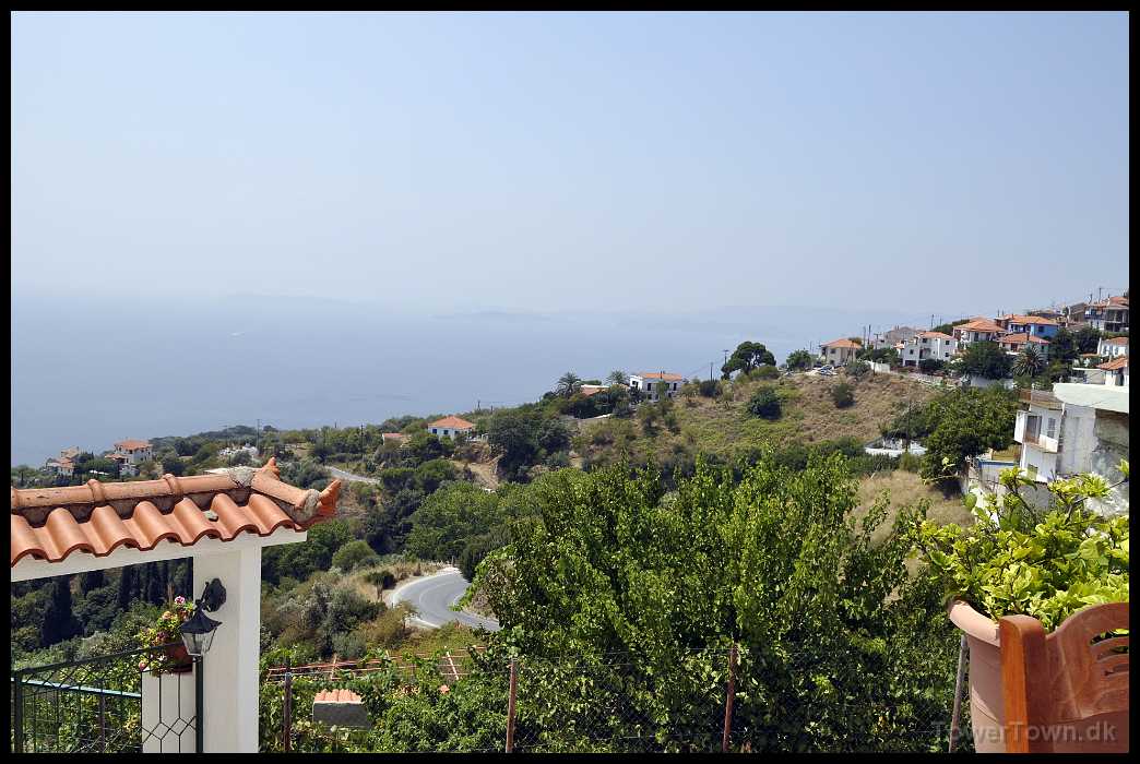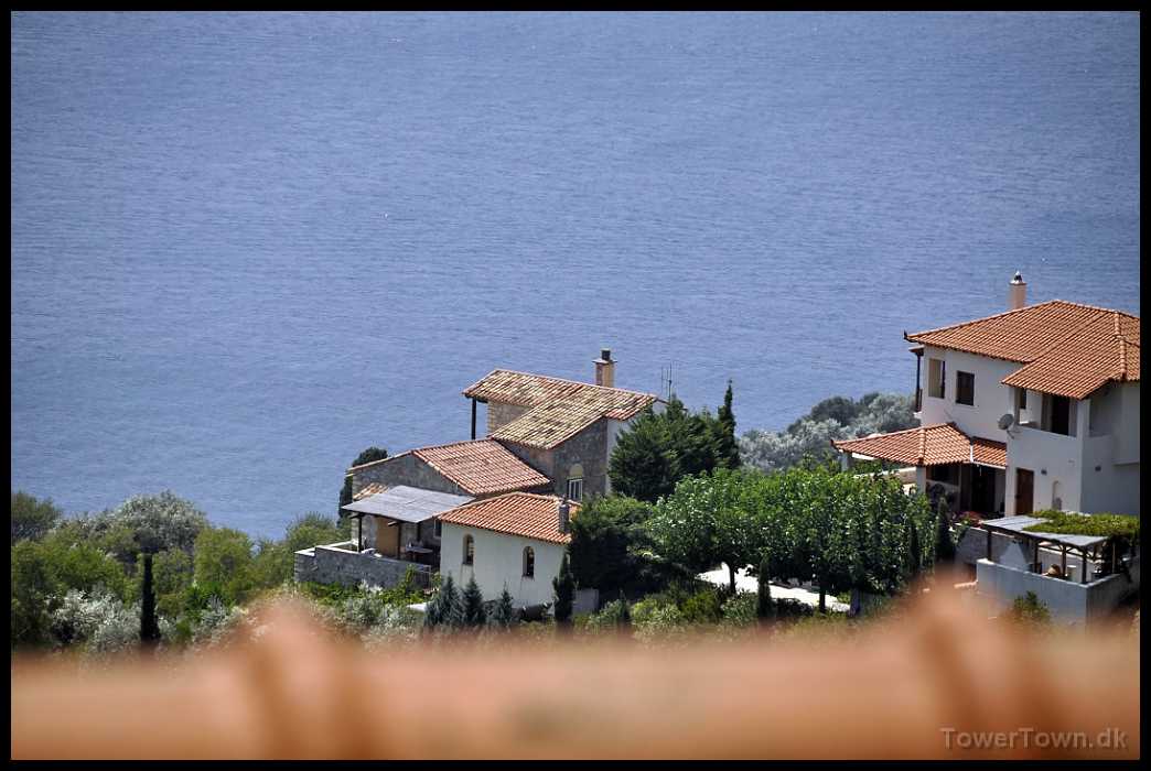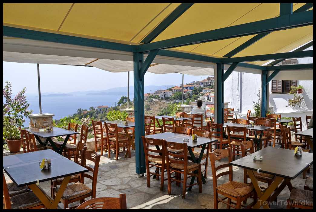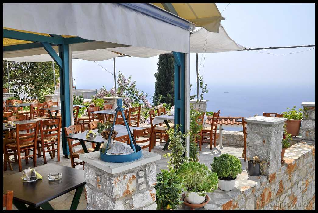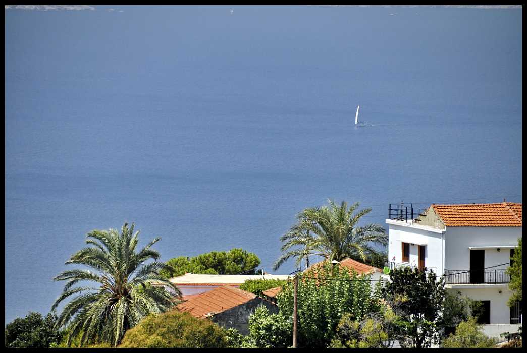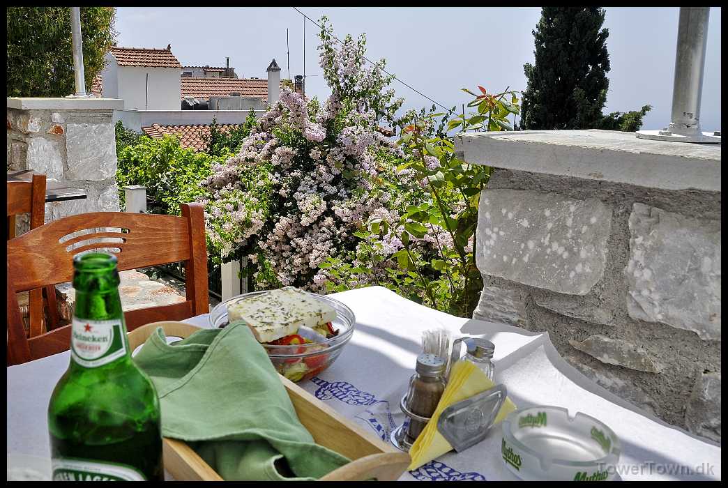Den græske salat ledsages her af en fremragende udsigt over havet.
