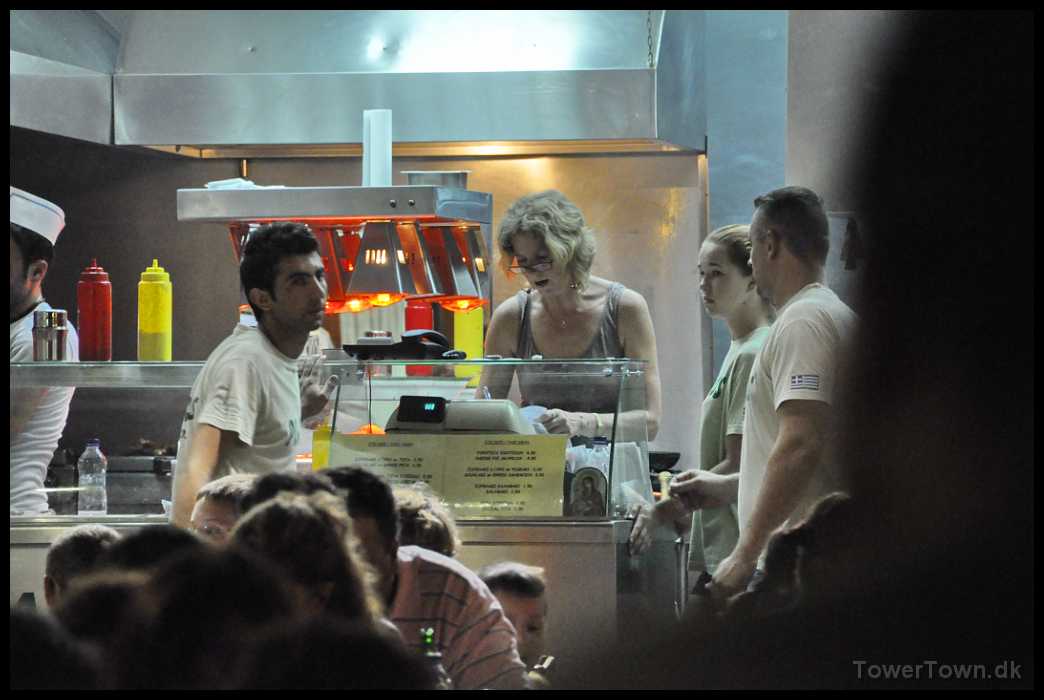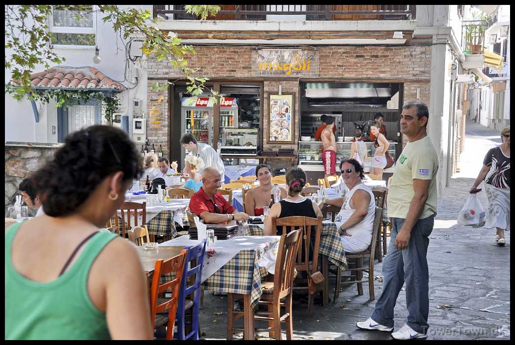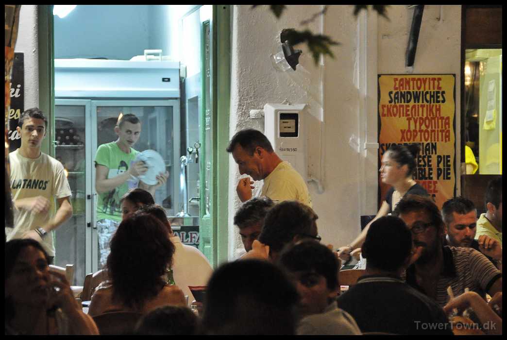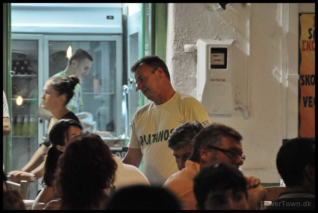 En tjener fra 'Taverna Platan' står klar til at invitere 'indenfor', uden dog at virke påtrængende.