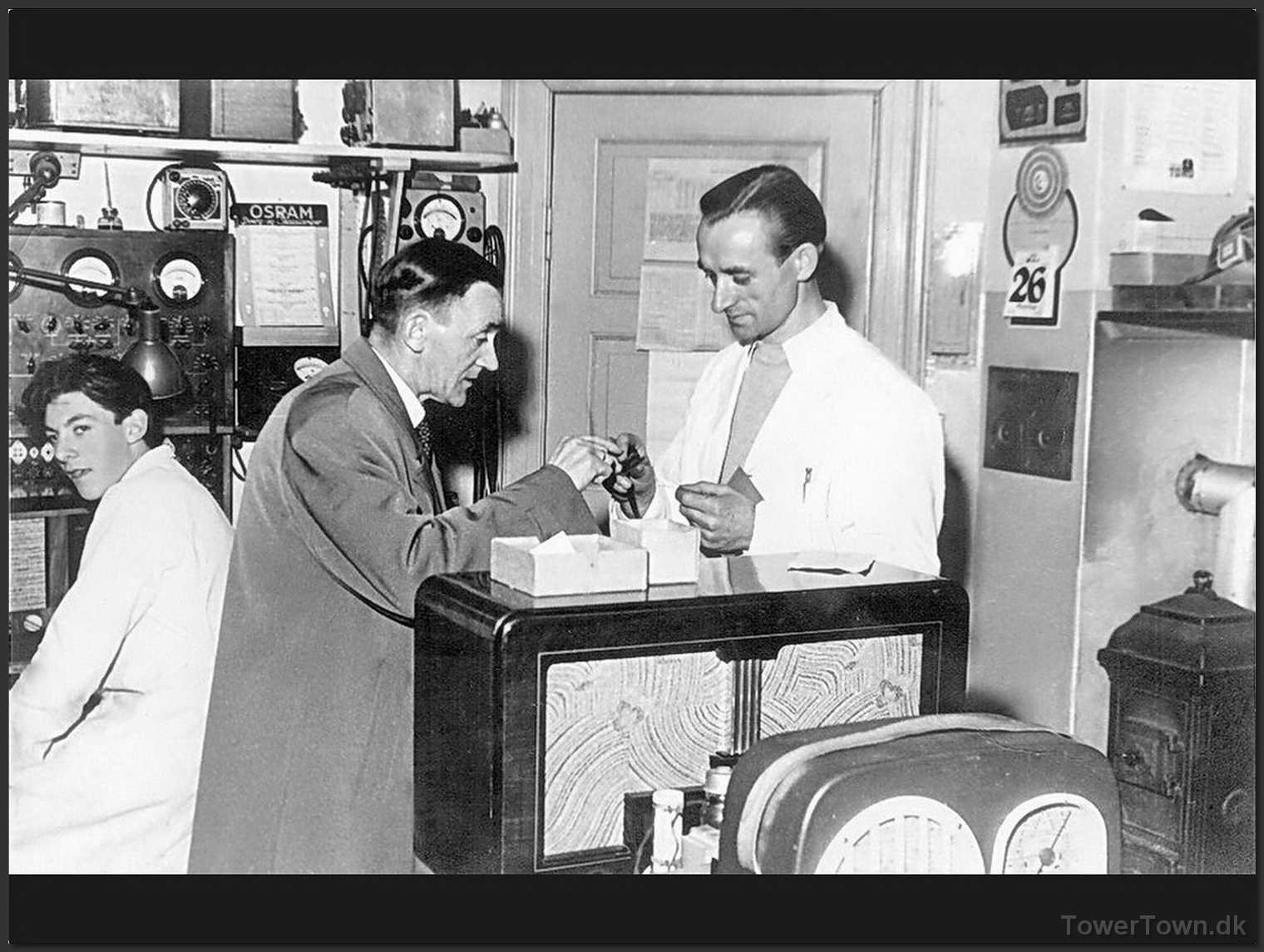 Tower Radio strakte sig et stykke med ad Nansensgade. Det er i øvrigt Kjeld & Dirch's berømte 'Nansensgade Skole' der skimtes midt i billedet tilbagetrukket bag flagstangen.