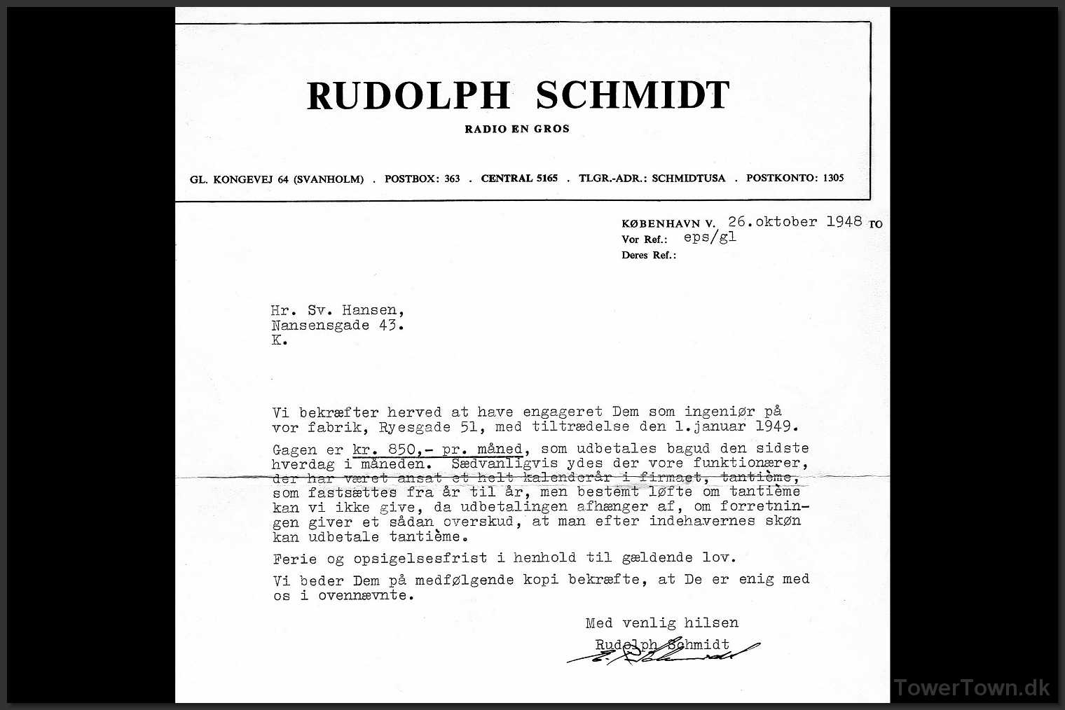 Selveste Rudolph Schmidt har her underskrevet Svend Hansens ansættelse som ingeniør på Unica Radio. Gagen var 850,- pr. md., med udsigt til tantieme.